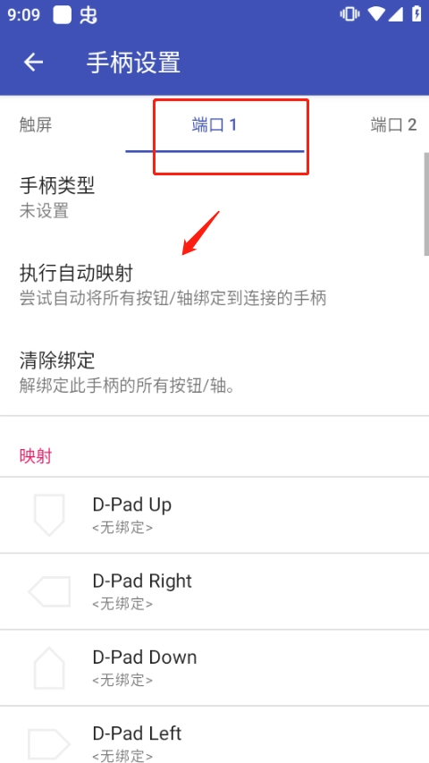 3、接着在“手柄设置”上方导航栏中选中端口 1选项,并在打开的界面中执行自动映射或手动设置手柄按键映射