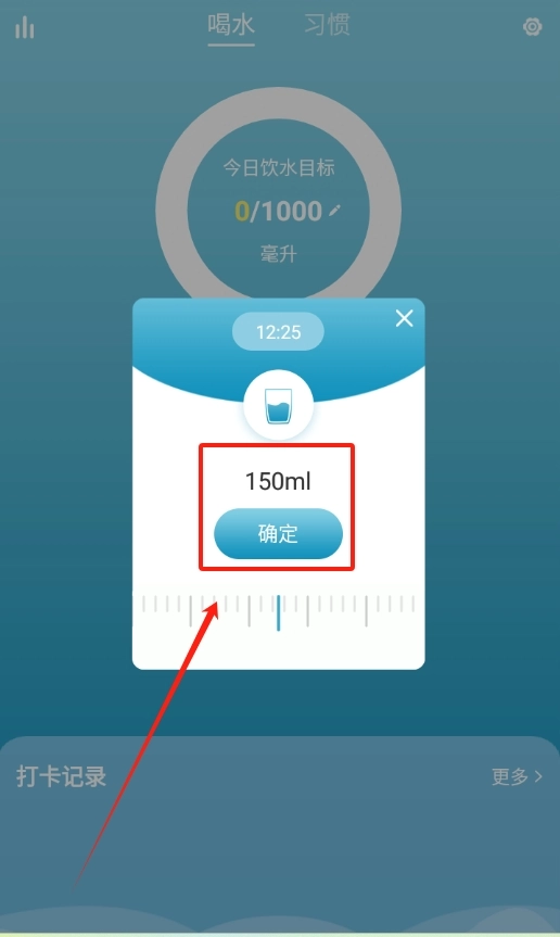 3、进入打卡页面后,在相应位置输入本次的喝水量,填好后,别忘点击 “确定”,这样就完成一次记录啦 。