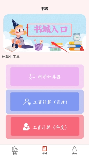 1、成功登录全搜小说后,在首页找到并点击“书城”功能入口,即可进入资源库页面。