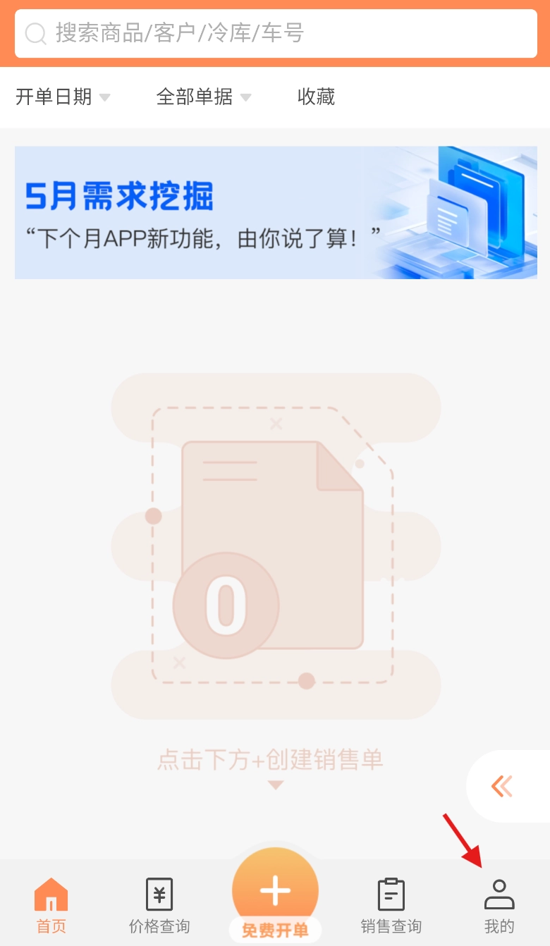 1、启动冻品开单王应用,在首页的底部导航栏中找到“我的”按钮,点击该按钮即可进入个人中心页面。