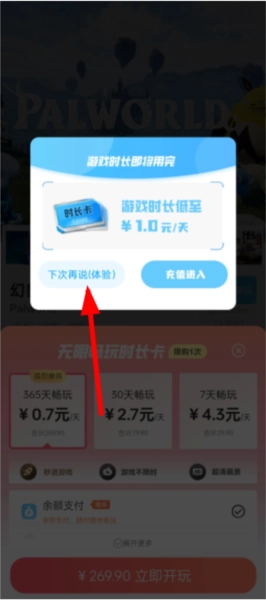 4、最后会出现一个时长卡提示,我们直接选择“下次再说”,就能免费体验游戏了。
