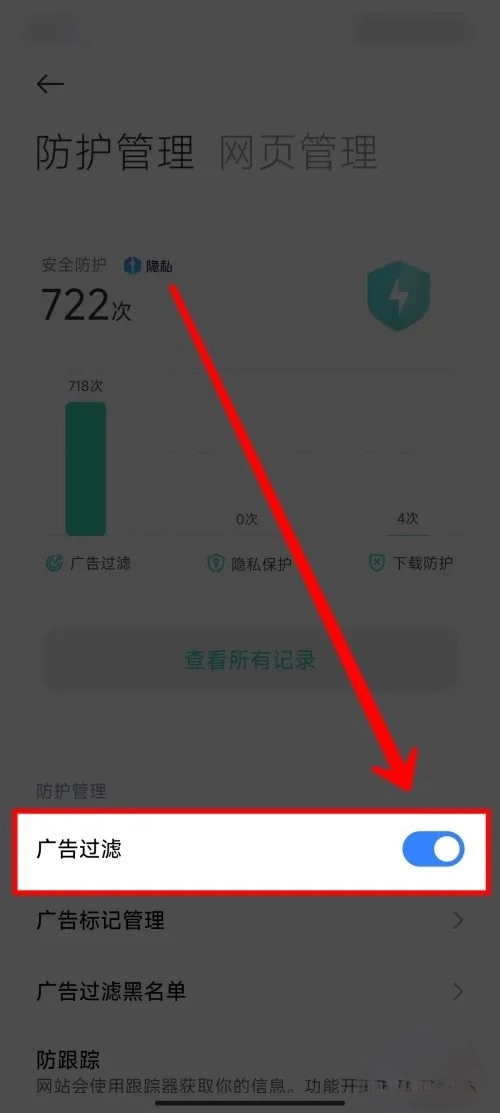 3、然后在隐私防护页面中,将【广告过滤】的开关打开即可。