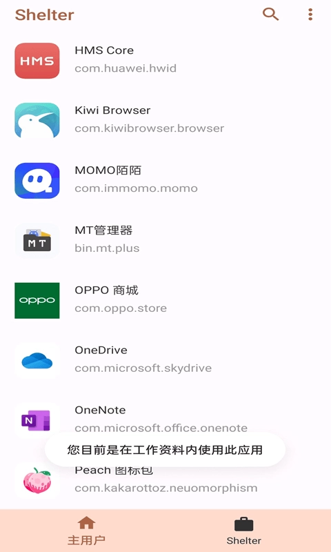 3、主用户就是正常安装在手机内的,点击即可将它安装到Shelter沙箱中