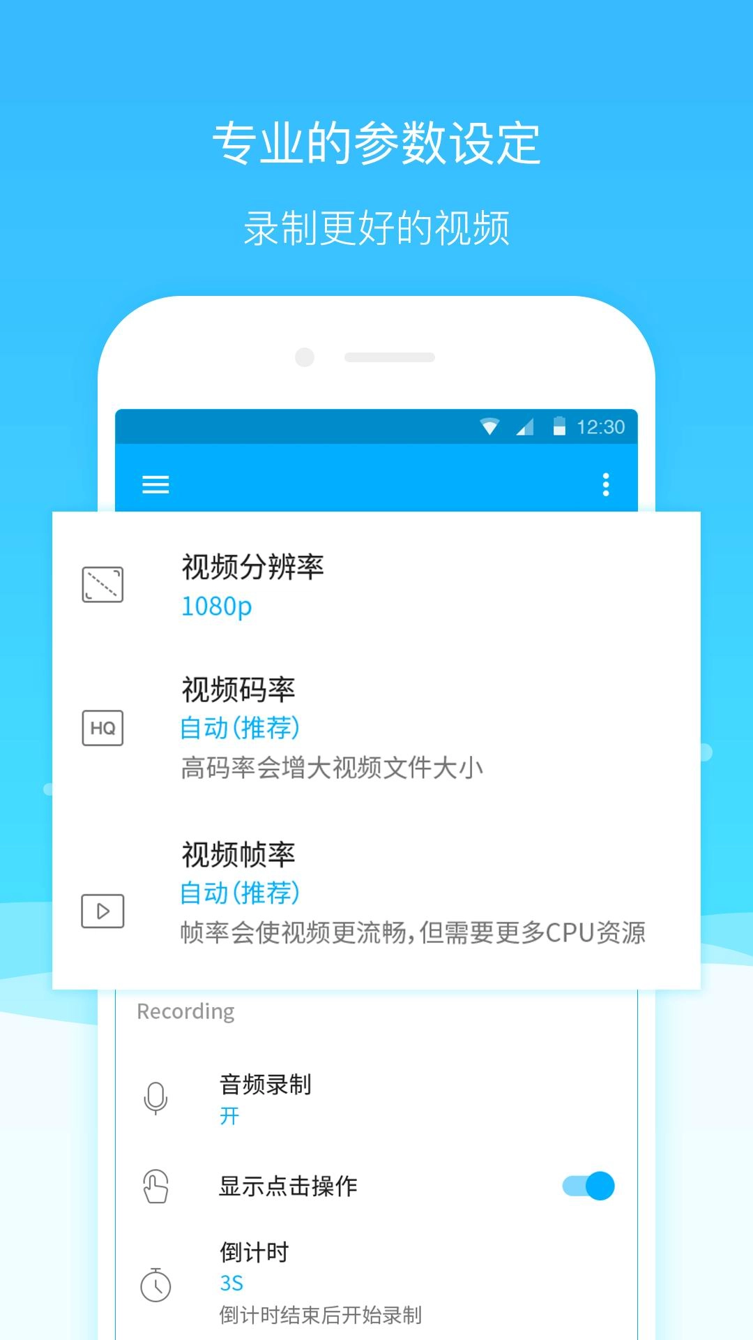 2.上方三角形就是开始录制,点击录制后会有3秒的准备时间