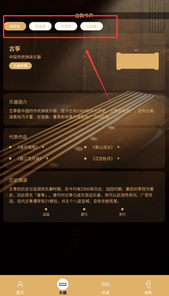 4、延伸拓展民乐知识板块,详细介绍古筝发展历史、流派特点和保养常识,帮助用户构建系统的音乐文化认知。