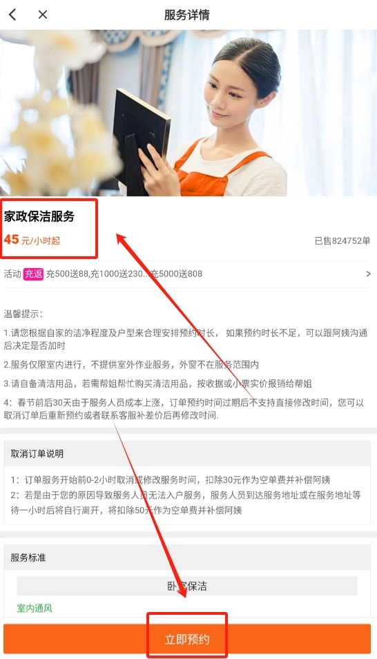 3 、浏览保洁服务详细内容,确认满意后点击页面底部 “立即预约” 按钮提交