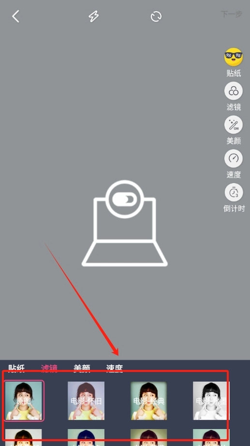2、完成拍摄后点击右侧的滤镜功能图标,可以看到多种不同风格的滤镜效果预览。