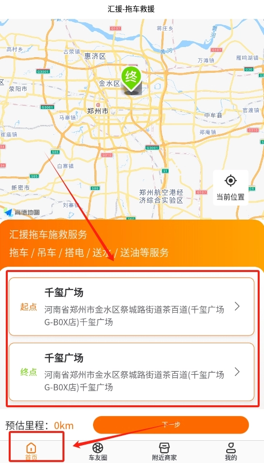 2 、地址框被激活后,在里面输入你车子现在所处的起点位置,或者你想要车辆被拖到的终点地址 。