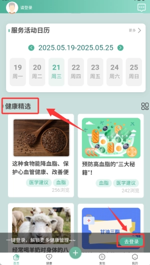 启动应用后,在首页找到并点击“健康精选”功能入口,即可进入登录页面。