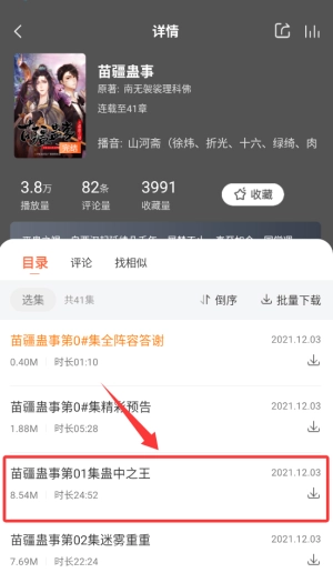 3、点击具体小说封面进入详情页后,在目录中选择相应剧集,即可享受专业播音员演绎的精彩内容。