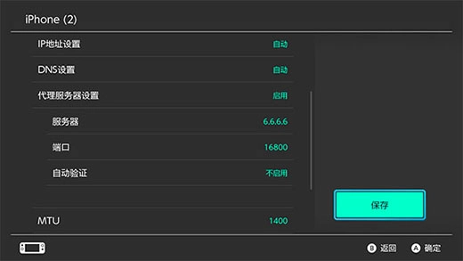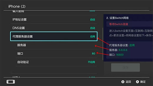 (1)先将代理服务器设置为启用,再根据加速成功后提示弹窗设置服务器和端口。 (tips: 请确保按照弹窗提示内容设置,否则可能导致Switch无网络
