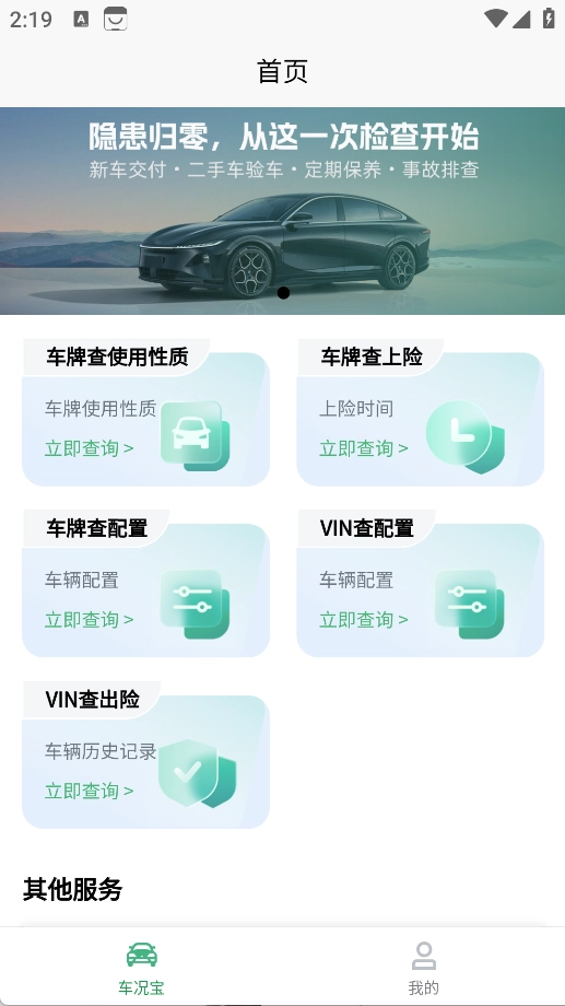 首页提供车牌查询使用性质、车牌查询上险情况、车牌查询车辆配置、VIN码查询车辆配置、VIN码查询出险记录等服务。