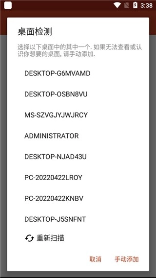 3、在接下来的界面中,您可以选择“重新扫描”来自动搜索可用的电脑,或者手动添加电脑的IP地址或名称。