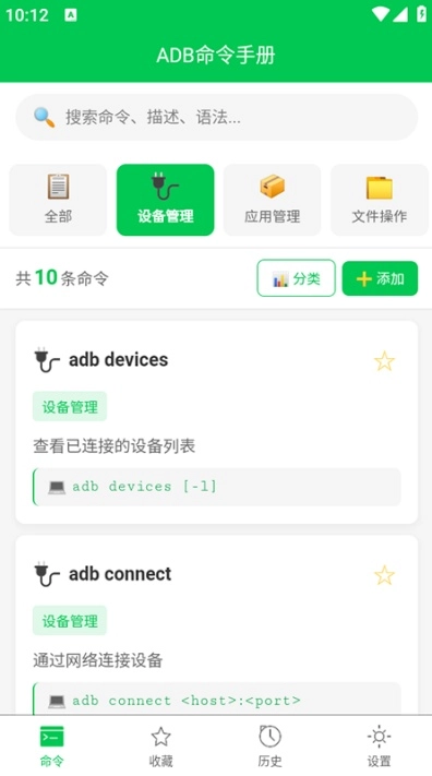 ADB命令手册安卓,其实就是个能查询、管理安卓系统ADB命令的实用工具,专门解决安卓开发者记不住复杂ADB命令、查询效率低的问题。免费版的ADB命令手册整合了超多常用ADB命令,支持按分类检索、收藏常用命令,还能自行添加新命令。它的核心价值是把零散的ADB命令系统化,主要面向安卓开发、测试工程师以及技术达人,针对性解决记命令费劲、找命令麻烦的困扰,使用起来特别便捷!