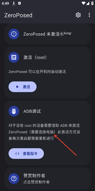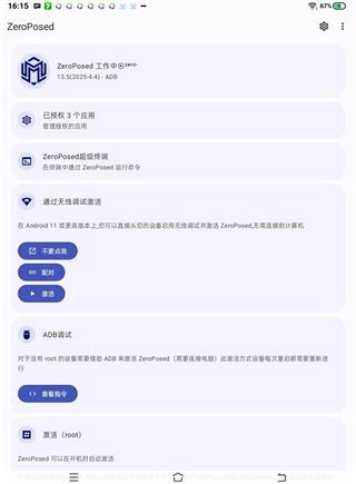 1、打开后就能进入激活界面使用,虽然里面提供了root模式下的激活选项,但通常不建议采用这种方式——毕竟用户选择shizuku或其魔改版ZeroPosed,初衷就是为了避免root操作。因此一般优先选择第二种adb调试激活:如果用户手机系统是安卓12及以上,只需先进入开发者模式开启无线调试功能,再打开应用就会出现无线调试的激活渠道。这种激活流程和shizuku一致,过程中会生成配对码,用户输入该配对码即可完成激活。