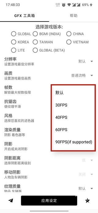 5、此外在gfx工具箱内还可以设置抗锯齿、阴影、纹理等多种数据修改,在设置完成后,点击底部“应用设定”既可开始体验啦!