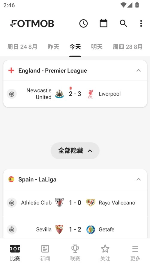 1、在FotMob这个平台上,软件会实时呈现每日足球赛事的比分情况以及各类体育相关的即时资讯,不少热爱足球的朋友都在使用这款应用。