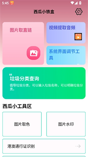 西瓜小铁盒是一款集成多种实用功能的手机应用工具合集,拥有获取图片直链、从视频里提取音频、调整系统界面样式、提取图片颜色以及去除图片水印等功能,操作十分简便,用户只需轻点就能使用。
