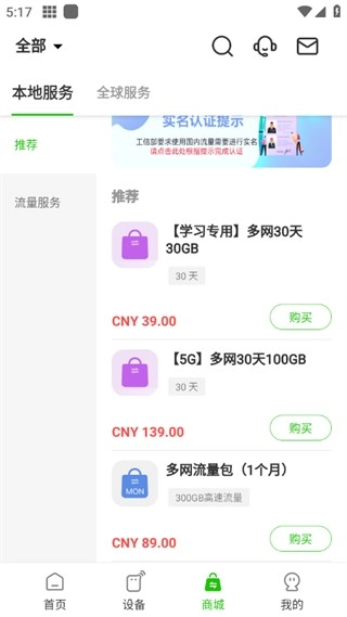 随时在线,畅行无忧!我们新上线了“套餐”页面,让流量包购买操作更便捷。同时还新增了5G设备专属移动流量,助力您出行全程无顾虑。
