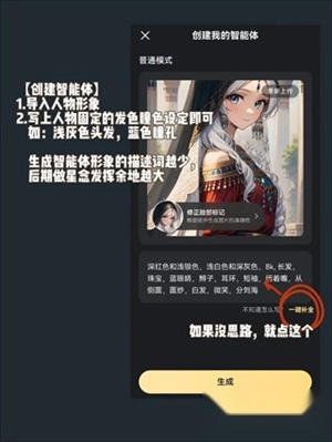 3、导入人物形象,写上人物固定的发色瞳色设定即可,如:浅灰色头发,蓝色瞳孔,生成智能体形象的描述词越少,后期做星念发挥余地越大
