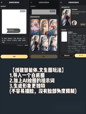 用户可自定义智能体的形象、声音、人设等细节,通过上传图片和简短的文字描述,生成高度还原的动漫形象。支持混合5种音色比例,实现独特的语音定制