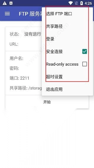 4、要是你想确保自己传输的安全性,还可以点击右上角,设置FTP端口、文件共享路径、登入密码等等。