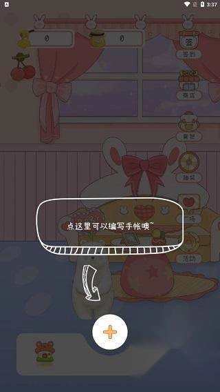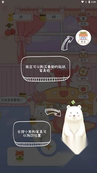 长按小熊和家具可以拖动位置;点击商店可以购买最新的贴纸、家具。
