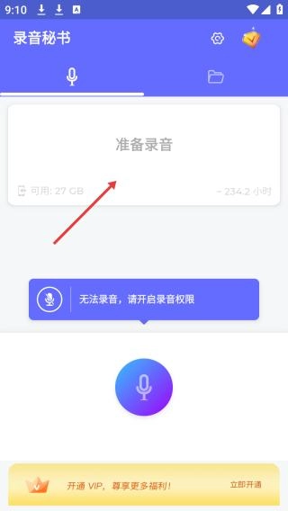 1、在本站完成安装后点击打开进入,进入主界面后会显示“准备录音”,界面下方提示“因未开启录音权限无法录音”,同时设有开通VIP的入口。