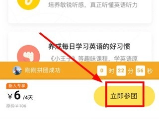 一、在芝士派英语平台若想添加课程,需前往课程界面完成购买操作,点击“立即参团”按钮进行购买后,就能将该课程添加至你的课程列表中了。