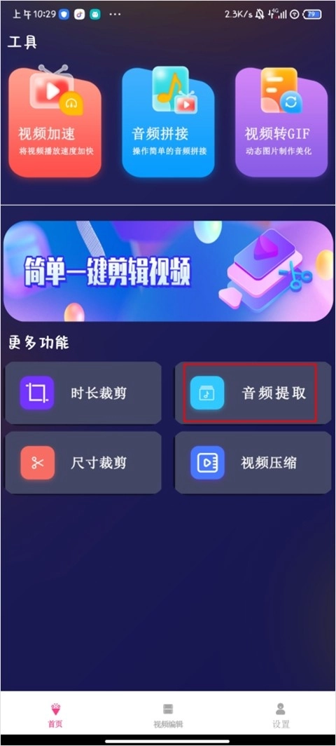 1、打开荐片安卓版,进入到用户界面,点击页面上方的“音频提取”选项;