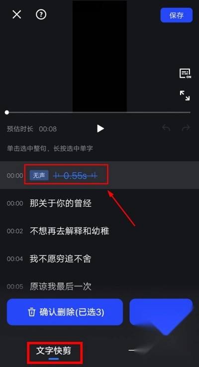 3、【文字快剪】可智能别视频:语气词,无声片段,重复片段;选中即可一键删除,快速提高剪辑效率!