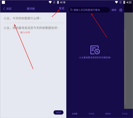2、通讯录舱可以记录当天的探索报告,并发送至基地,点击太空舱左上角小标可以进入基地查看任务报告;