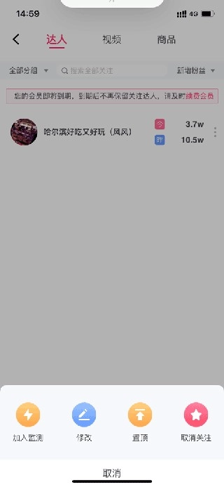 3、取消监控数据的主播,同样的方式,在在灰豚数据App首页,在关注列表里,点击更多,在竖的“…”可以取消关注。