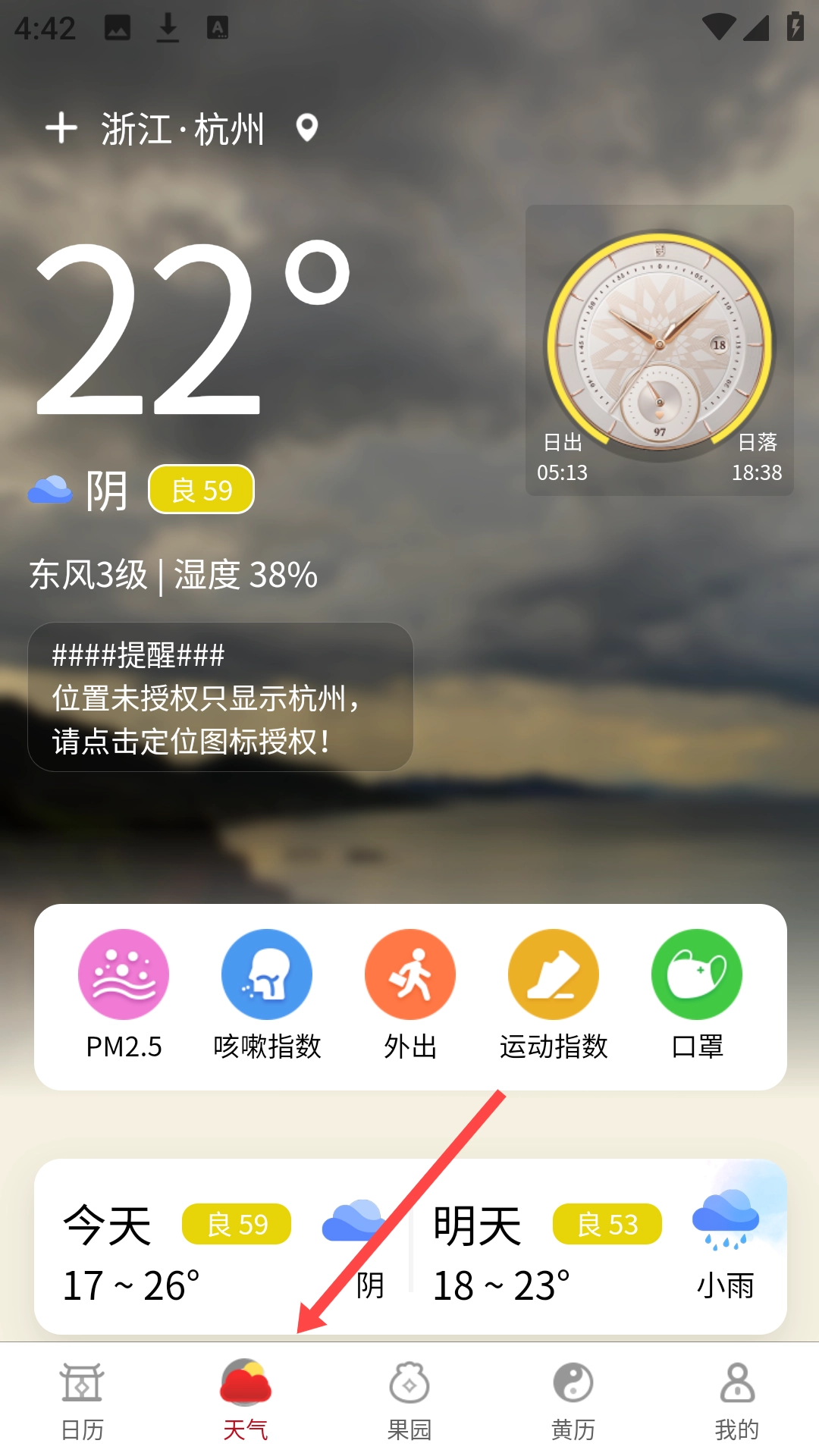 2、点击下方的天气可以查看今天的天气情况。