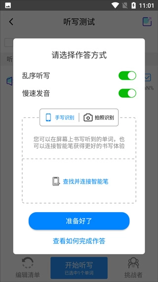 3、开启乱序听写、慢速发音,手写识别/拍照识别任选