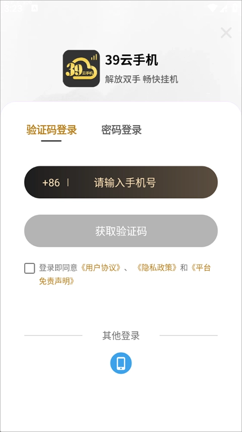 1、下载安装39云手机应用,启动后需通过手机号接收验证码完成登录操作。