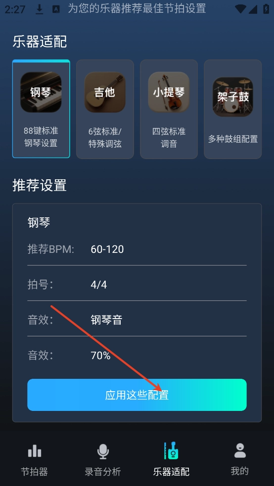 3、选择相应的乐器点击【应用这些配置】,就可以轻松应用相应的配置。