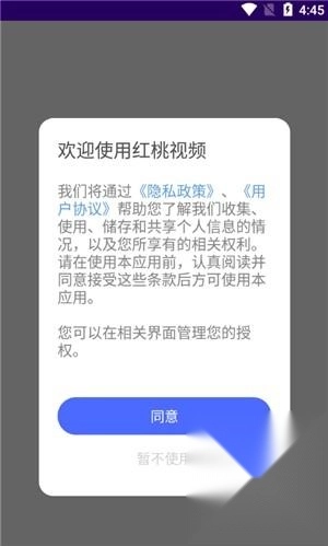 首先,您可以在本站下载并安装红桃影视的最新版本。打开应用后,会看到需要阅读隐私政策和用户协议,若没有异议,点击同意即可。