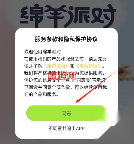 1、打开绵羊派对应用,点击同意协议后进入软件