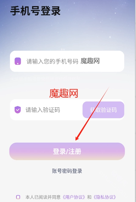 注:首次使用的使用直接输入手机号以及验证码即可自动注册账号!
