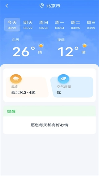 1、通过,用户可以根据个人行程查看每天的天气变化,甚至是之后的7-15天的天气预报,方便可以为行程或出差提前准备;