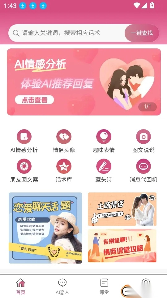 恋爱聊天回复神器安卓版,海量聊天话术,支持定制多种AI虚拟恋人,收录丰富实战案例。此外还提供情侣头像、表情包素材等资源,具备AI情感分析功能,助力用户提升聊天情商,朋友圈文案每日更新。