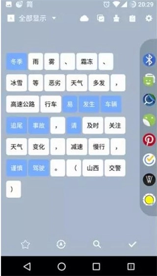 4、对于不希望软件后台运行的用户,可通过系统分享按钮将复制的文本发送至,同样可以使用智能分词功能。