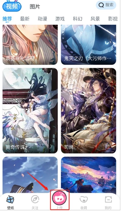 1、点击底部的【上传】按钮,接着选择视频或者微动壁纸这两种类型之一。