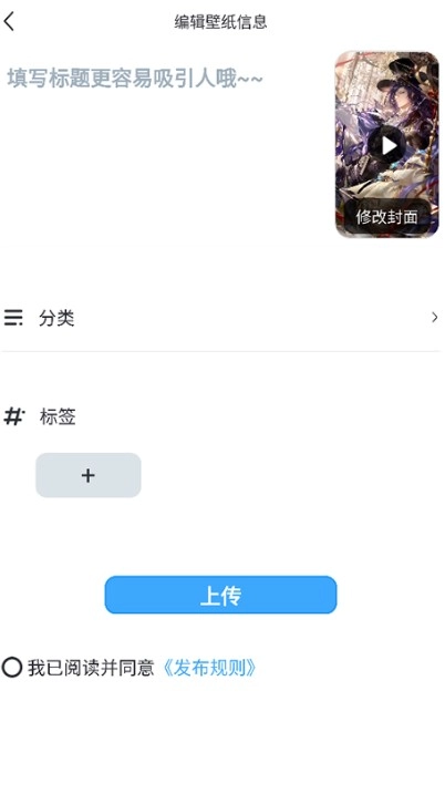 2、选中本地动态壁纸,填写名称与标签后点击【发布】。