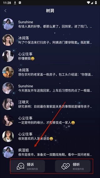 在树洞展示页面,可看到“倾诉”与“倾听”两个不同选项。其中,“倾诉”是供用户输入自身问题或困扰的区域,而“倾听”则具备查看其他用户所提问题的功能。