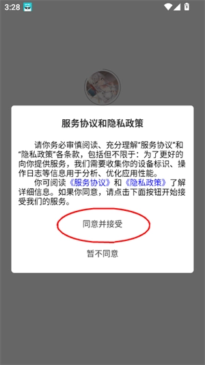 1、启动尘缘轻水应用,同意并接受相关服务条款与隐私政策。