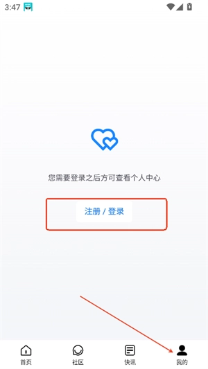 2、点击屏幕右下角“我的”,然后点击“注册/登录”按钮。