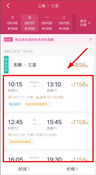 2、在查询结果页面,用户可根据自己的出行时间或是其他需求来选择合适的机票来购买;