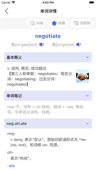 2.按词根分类背单词:提供了根据词根分类的功能,让用户能够迅速背单词。权威的例句帮助用户理解单词的用法,使记忆更加牢固。
